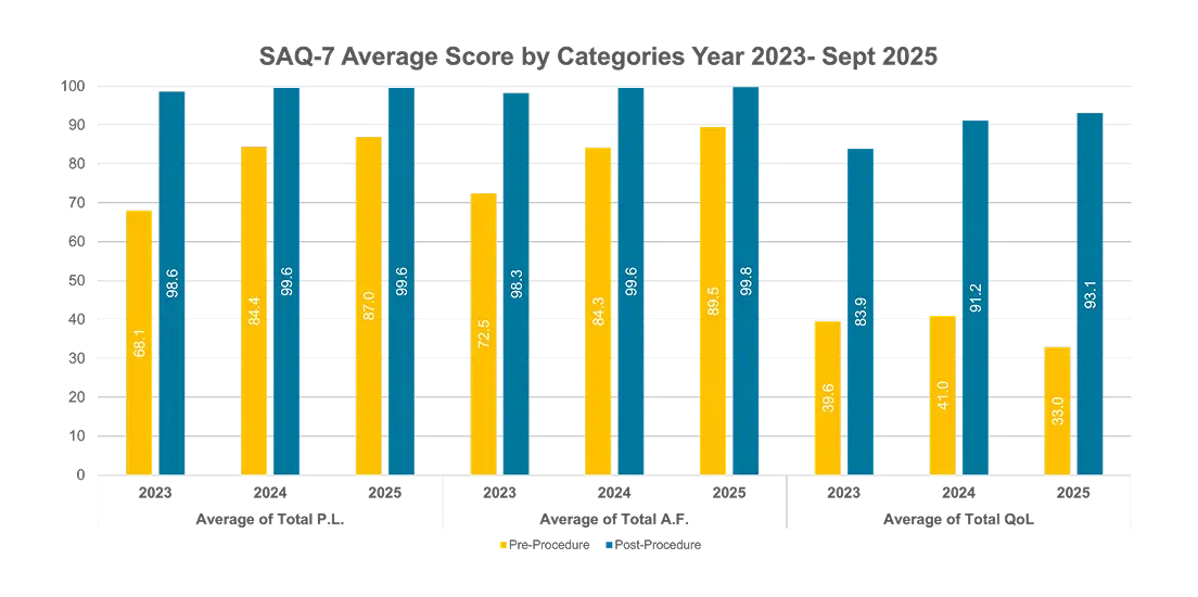 Patients complete the SAQ-7 before PCI and at follow-ups 1 month post-PCI, to monitor recovery. By comparing your scores over time shows whether your treatment has led to meaningful improvements in your symptoms and daily life. Minimum Clinically Important Difference (MCID) refers to the smallest change in your SAQ-7 score that is considered meaningful to you. If your score improves by at least the MCID, it means your recovery or treatment benefit is noticeable and meaningful in your daily life.