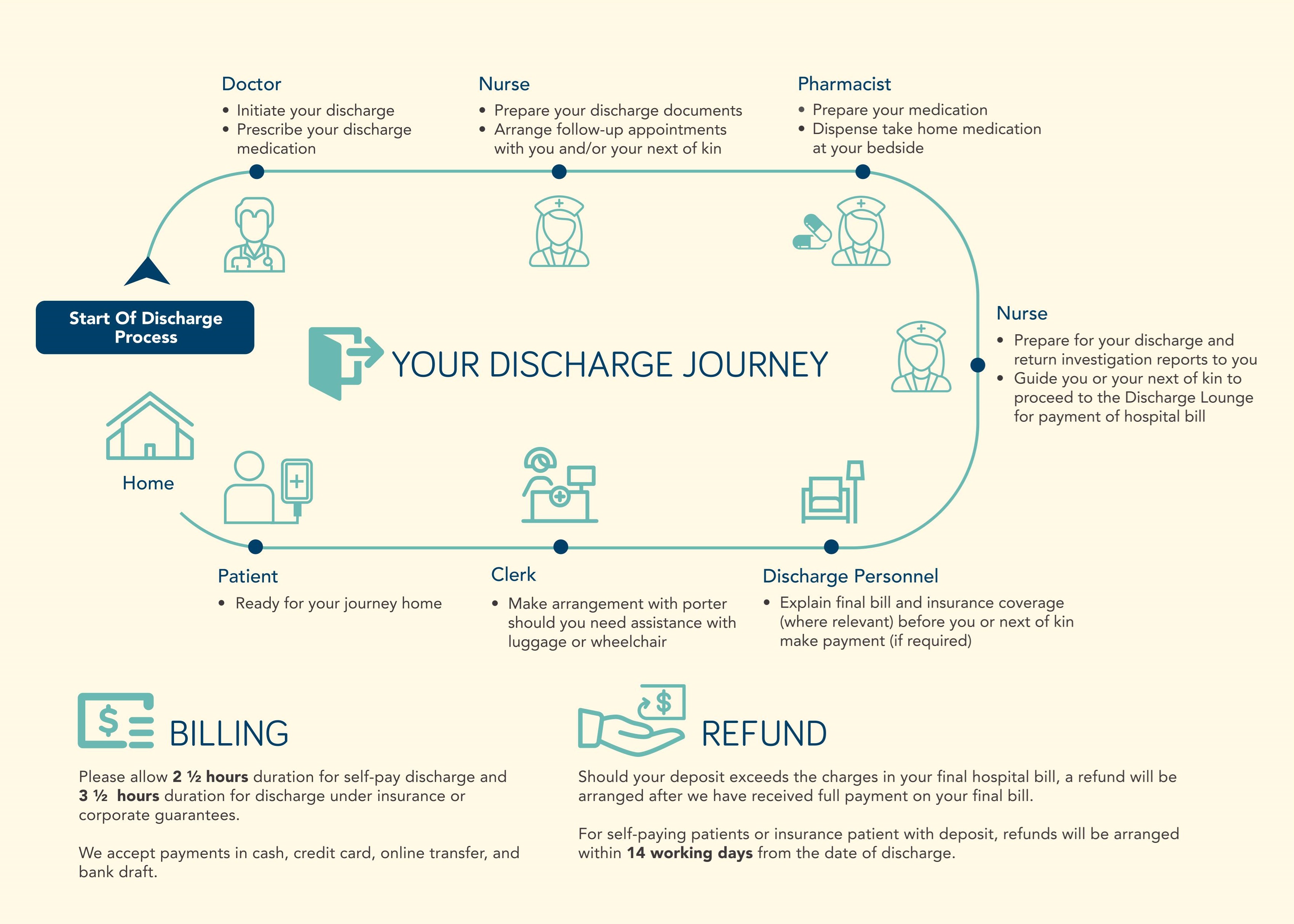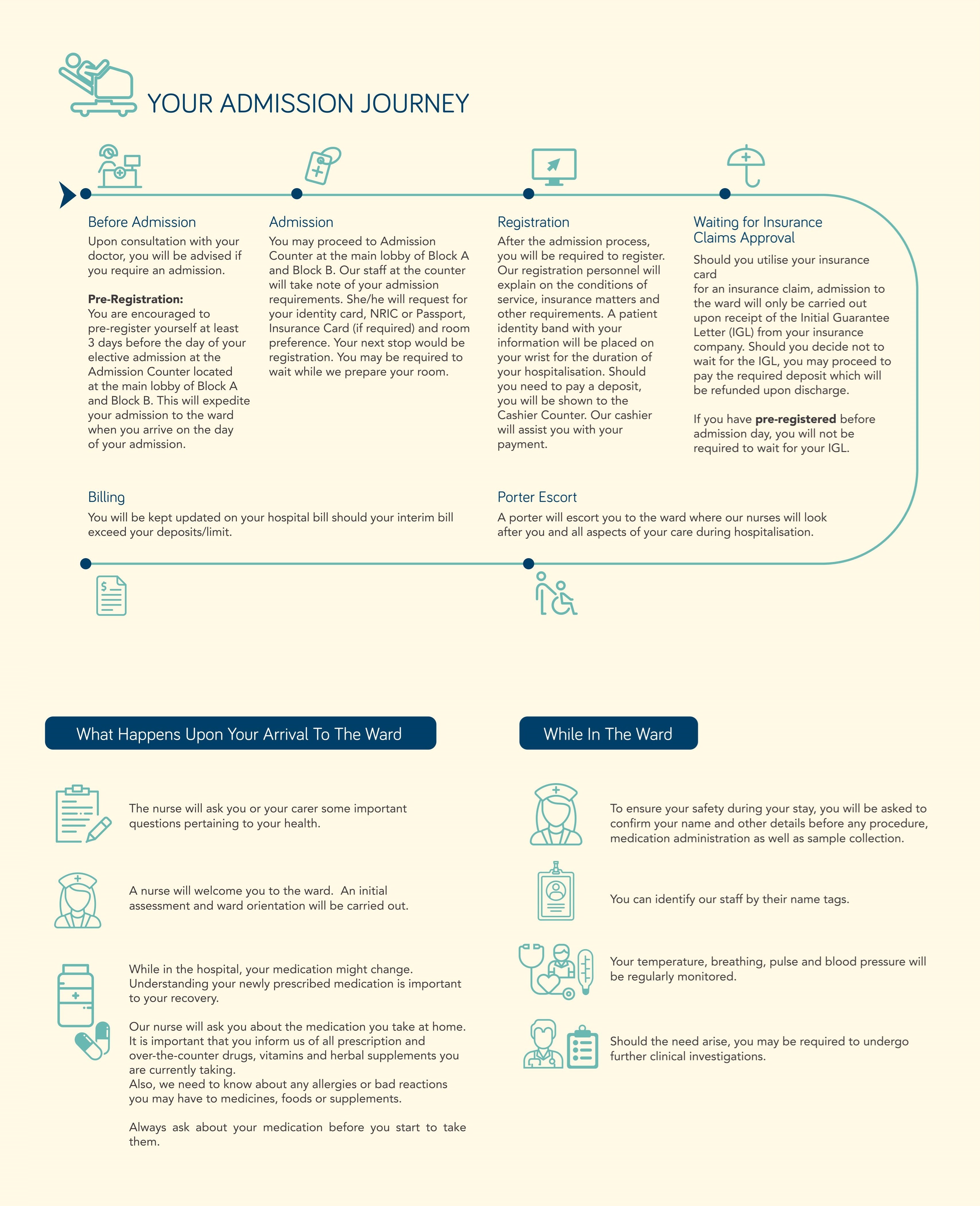 Our concierge team is available to assist you with your luggage upon admission and discharge. Wheelchair assistance is also provided upon request. For concierge service, please contact us at +603-4141 3001 or +603-4141 3583.