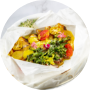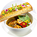 Chicken with vegetables steamed in a parchment paper envelope, served with tomato soup made with three different types of tomatoes with herbs and a smoked garlic croissant for dipping